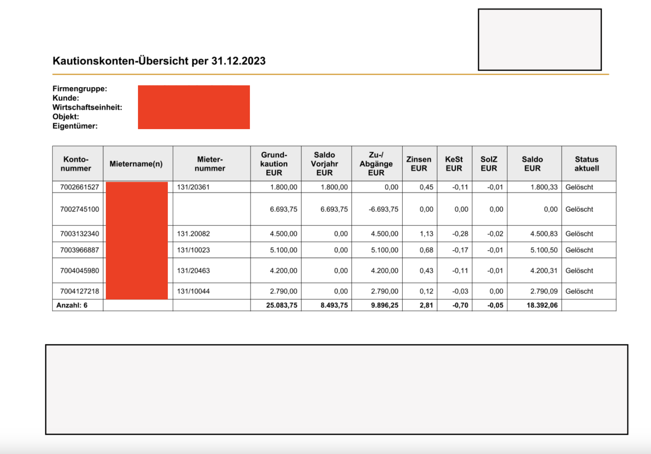 Die Übersicht sollte die Höhe der Kaution für jeden Mieter mit dem Saldo sowie dem Beginn und Ende des Kalenderjahres enthalten.